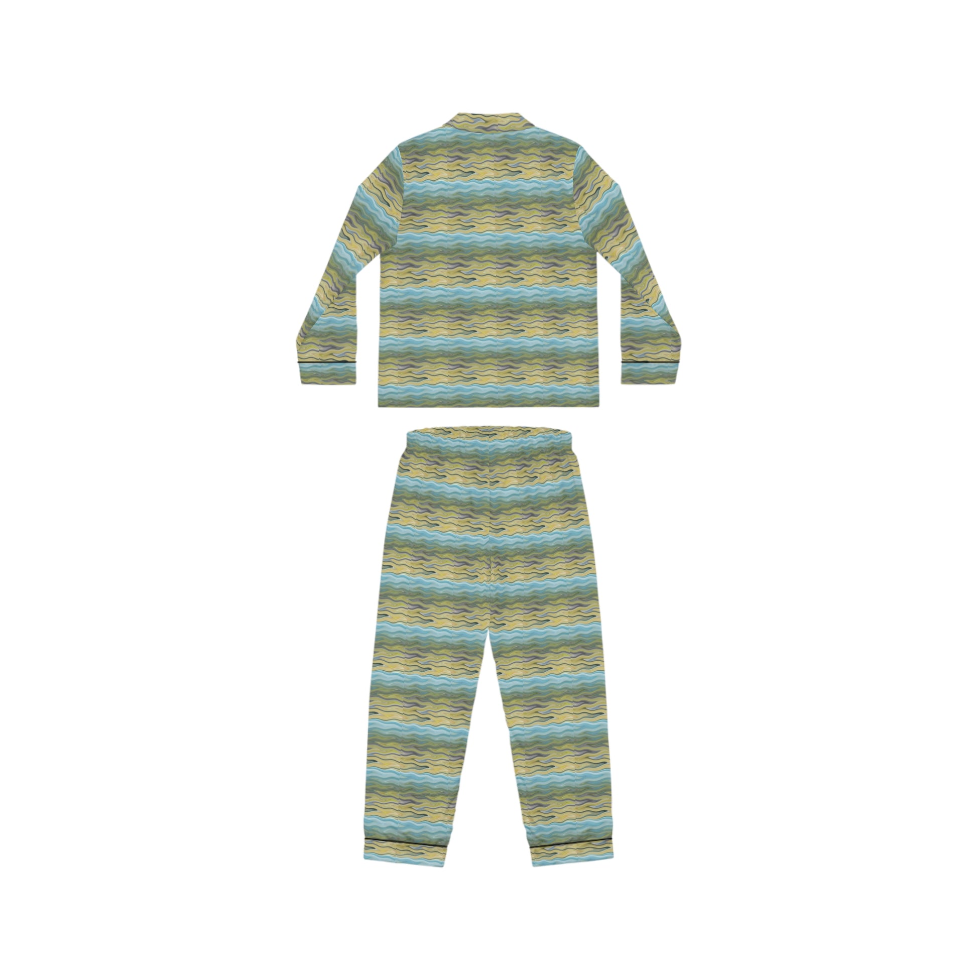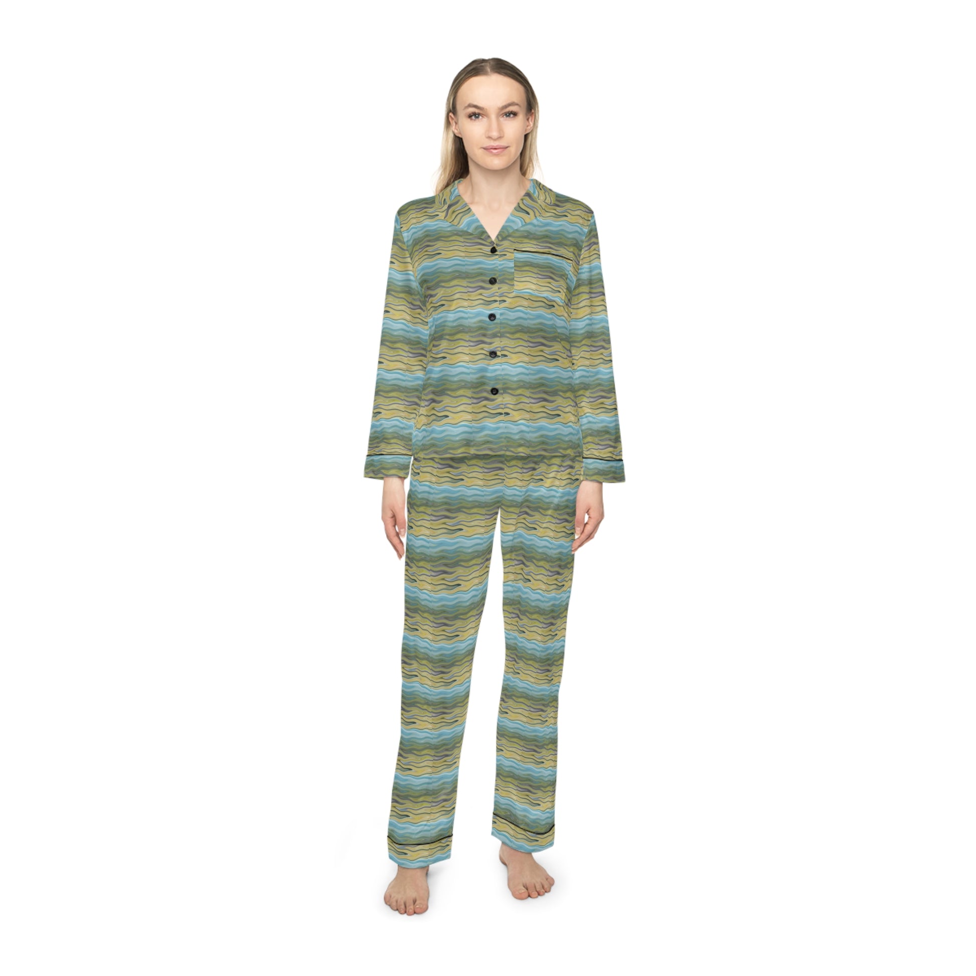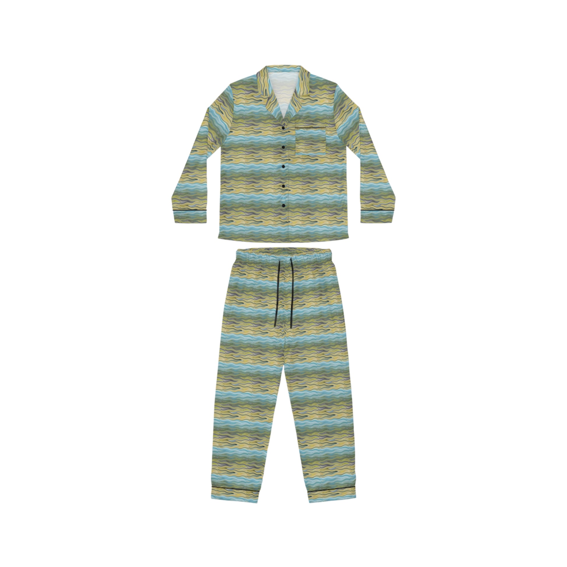 Sleek and silky, these satin pajamas elevate any nighttime ritual. Featuring artwork from the Imaginature™ Waterlillies Collection, this design explores blended greens, blues, and warm yellows inspired by water lilies floating on a sunlit pond. The notch lapel and adjustable drawstring waist add a tailored touch while keeping the silhouette relaxed. Since the style runs small, please refer to the size chart. We recommend sizing up 1-2 sizes for the perfect fit.